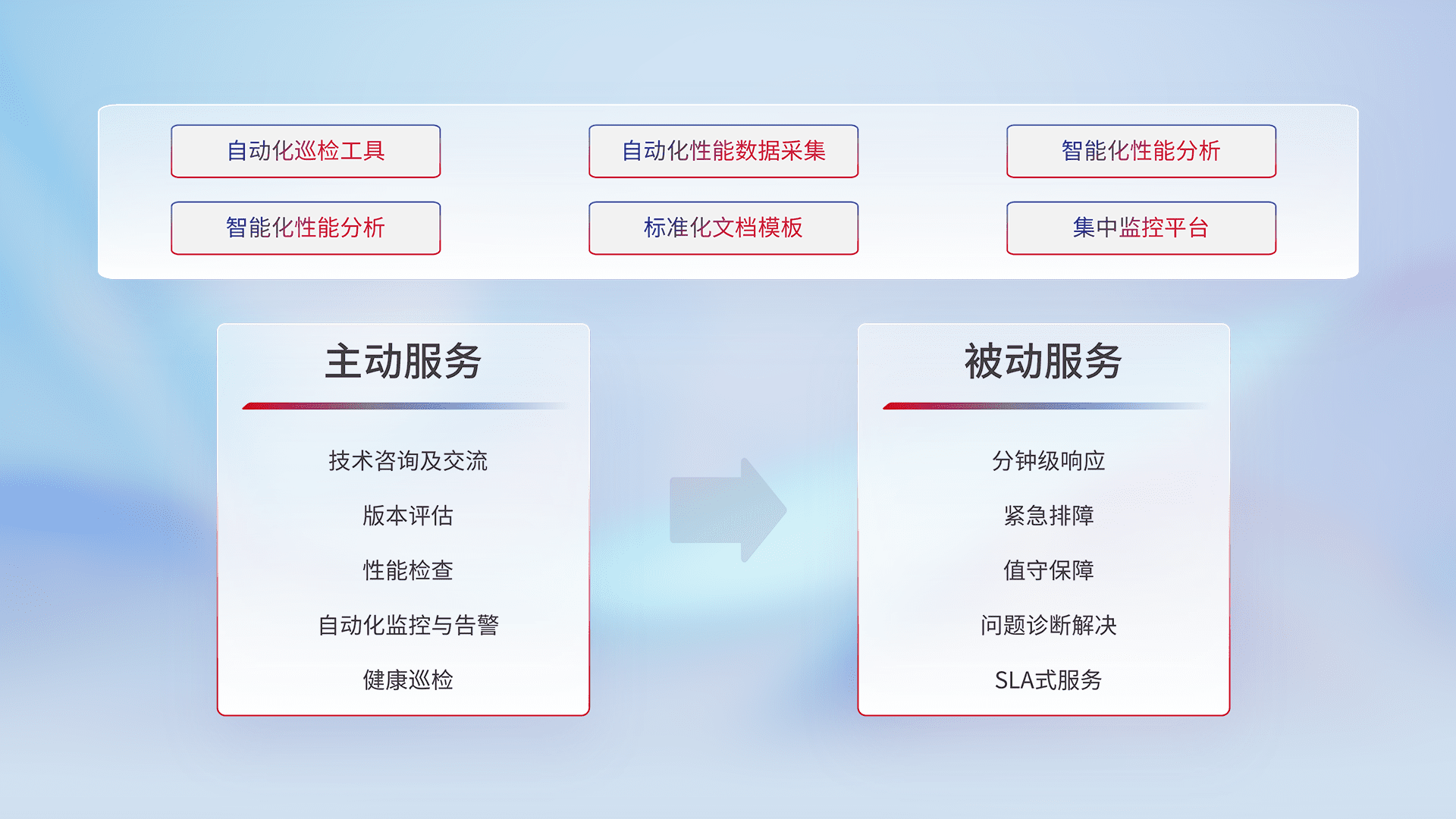 智能化工具和标准化文档,,保障服务质量,,,,提供主动服务(包含技术咨询、、、、版本评估、、、、性能检查、、、自动化监控与告警、、、、健康巡检)和被动服务包含(分钟级响应、、、紧急排障、、、值守保障、、问题诊断解决、、SLA服务)。。